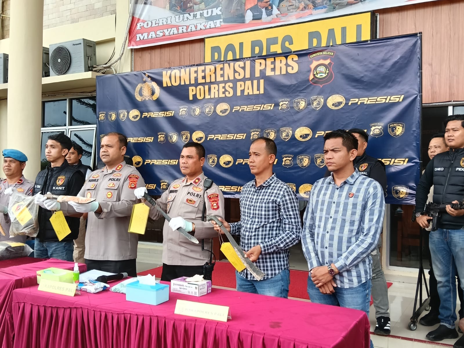 AKBP Yunar Hotma Parulian Sirait, S.H., S.I.K., M.I.K, Kapolres kab Pali didampingi Wakapolres, memberikan keterangan bahwa Kepolisian Resort, telah berhasil mengamankan Dua (2) tersangka, terkait dua korban ditemukan di kebun sawit Desa Sungai Ibul Kecamatan Talang Ubi.