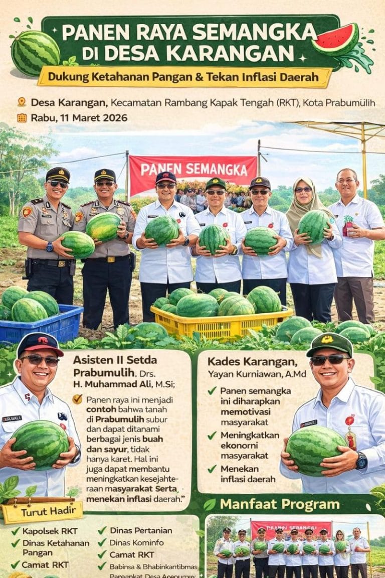 Prabumulih – Asisten II Setda Kota Prabumulih, Drs. H. Muhammad Ali, M.Si menghadiri kegiatan Panen Raya Semangka Ketahanan Pangan yang dilaksanakan di Desa Karangan, Kecamatan Rambang Kapak Tengah (RKT), Rabu, (11/3/2026).