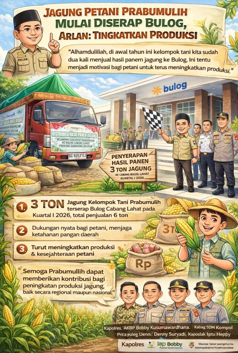 Hasil panen jagung petani di Kota Prabumulih mulai diserap oleh Badan Urusan Logistik (Bulog). Wali Kota Prabumulih, H. Arlan, secara langsung melepas penjualan hasil panen jagung kelompok tani ke Bulog Cabang Lahat sebanyak 3 ton pada kuartal pertama tahun 2026, Jumat, (6/3/2026).